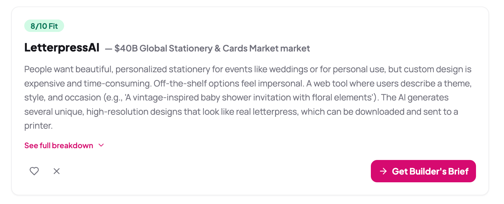 It’s called Spark. You give it your LinkedIn URL and answer a few questions on your interests and constraints (like how much time you have and what you’re trying to accomplish), and it generates business ideas with real market context.