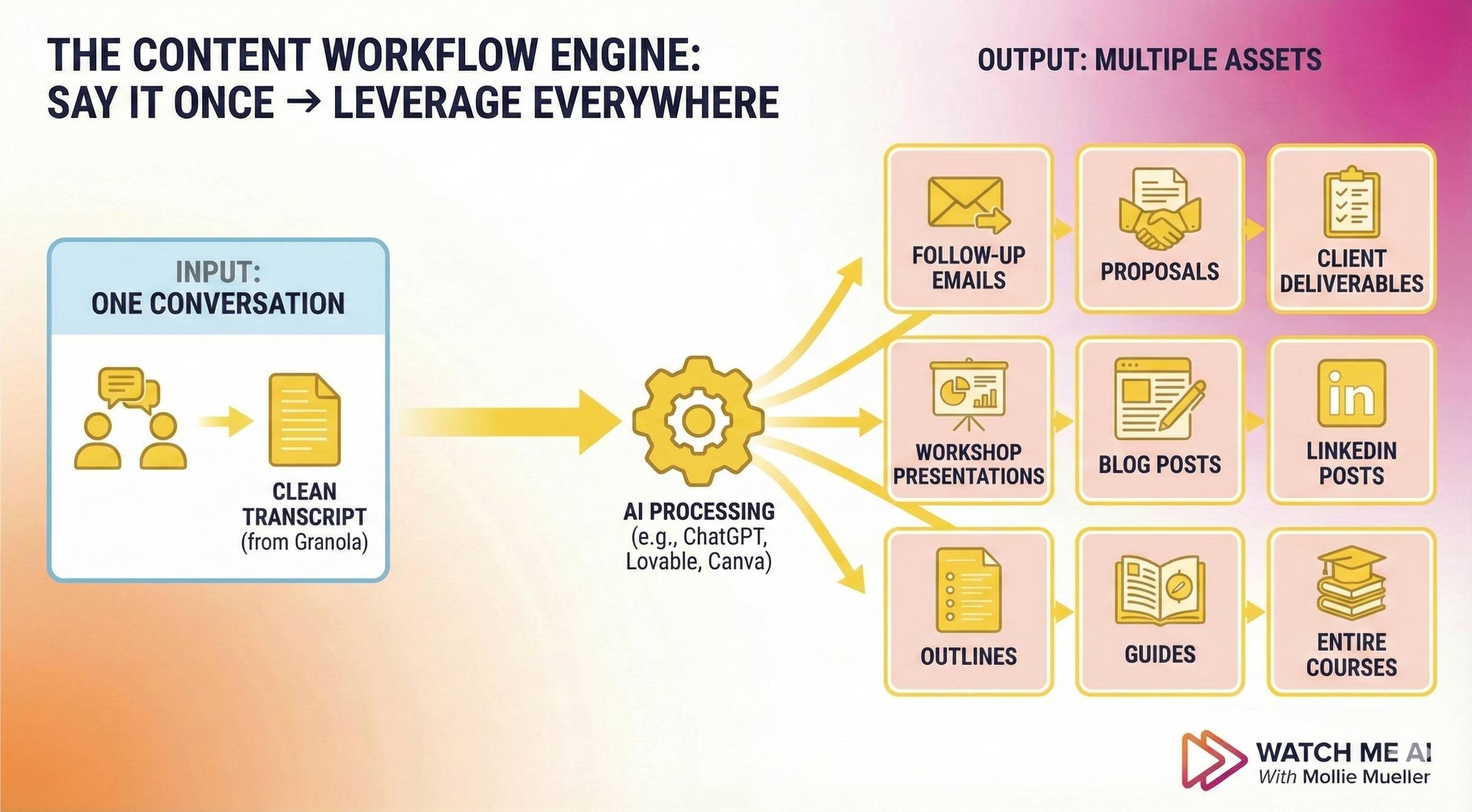 Here is the process I use to turn one conversation into multiple deliverables without typing from scratch: