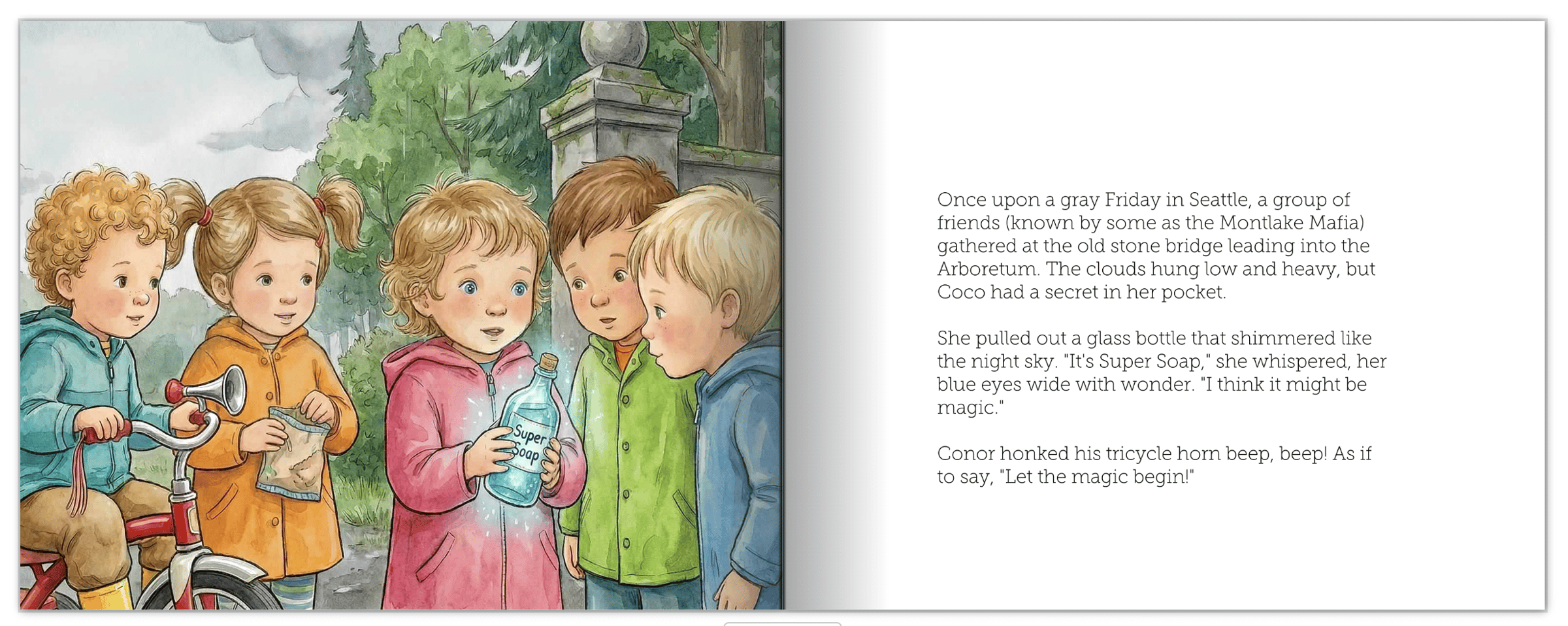 The Script (Gemini): I told Gemini I wanted an adventure story set in our neighborhood starring five toddlers. I fed it their names and one defining quirk for each child to personalize the plot. It took time to get the plot to a version I liked.