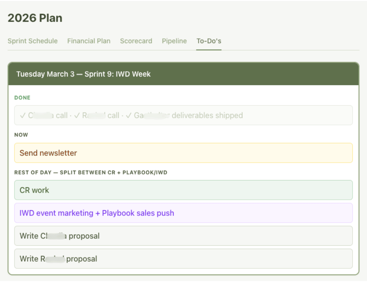 Inside my Business Building project, I have one conversation I use many times a day. I’ve gotten Claude to build me a visual dashboard with tabs for my financial projections, weekly scorecard, pipeline, sprint plan, and to-do list. Every morning I open it and say “what am I supposed to do today?” or rattle off what’s in my head, and we make a plan for the day together.