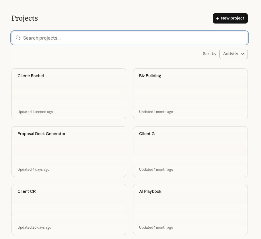 I have a Project set up for every client, one for my online course, one for this newsletter, and one called “Business Building” where I do everything from financial planning to daily to-do lists. Each one has instructions and reference files uploaded, so Claude always has context.