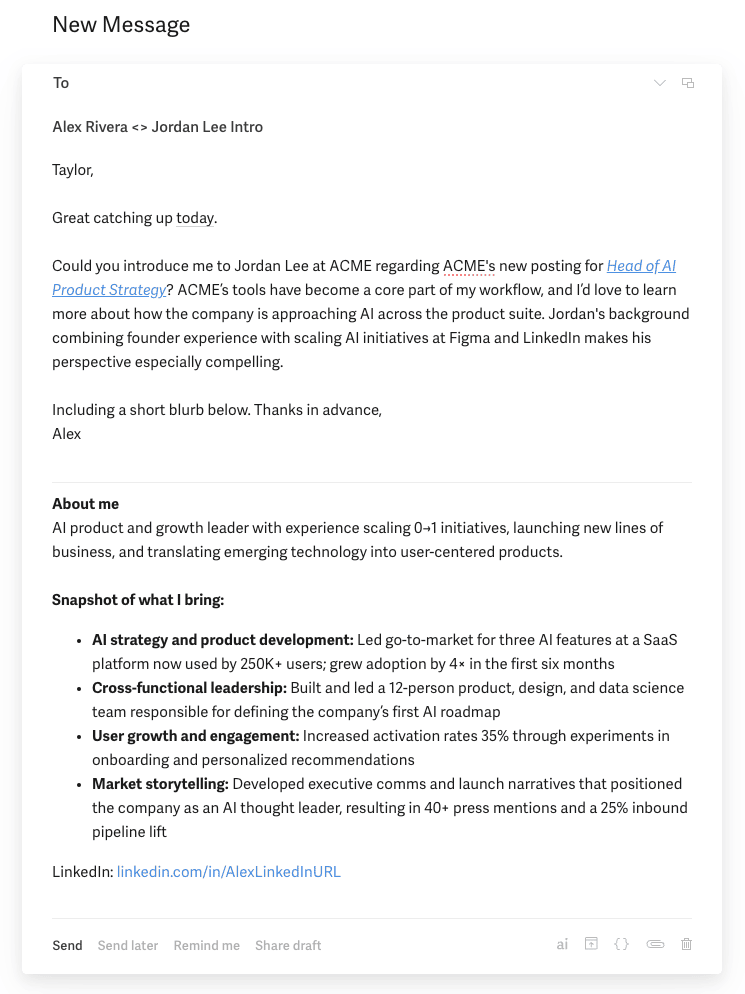 In the above example, Alex (the sender) has made a clear ask, given a strong reason for "why", added details/flattery on "why them" (i.e., specific mention of Jordan's relevant experience), and included a personalized "why me" section to prove relevance.