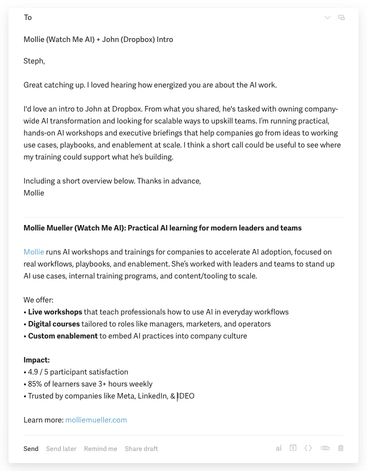- Subject line: Simple and clear: Mollie Mueller ↔ [Name] Intro